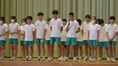本日、山形県中学校総合体育大会へ出場する陸上競技・卓球・新体操と 全日本吹奏楽コンクール置賜地区大会へ出場する吹奏楽の壮行式を行いました。
